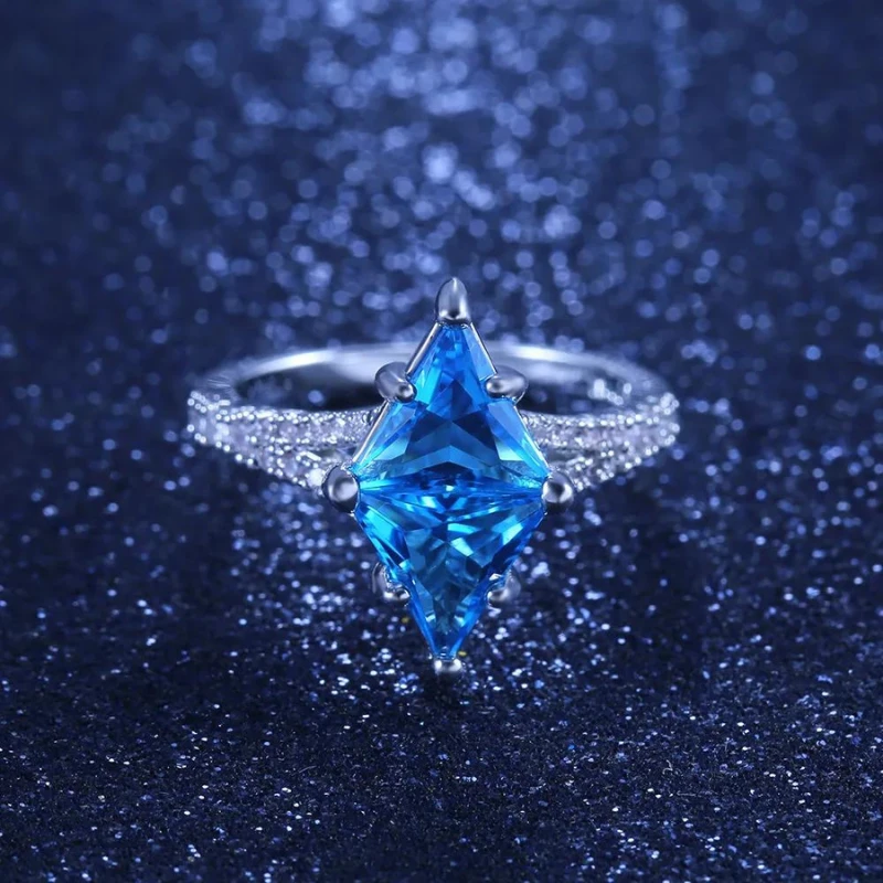 Le saphir synthétique de cette bague se distingue par sa taille imposante et sa forme triangulaire distinctive, évoquant une aura de sophistication. La teinte bleue de la pierre synthétique évoque la tranquillité d’une brise légère, ajoutant une dimension poétique à ce bijou exceptionnel.