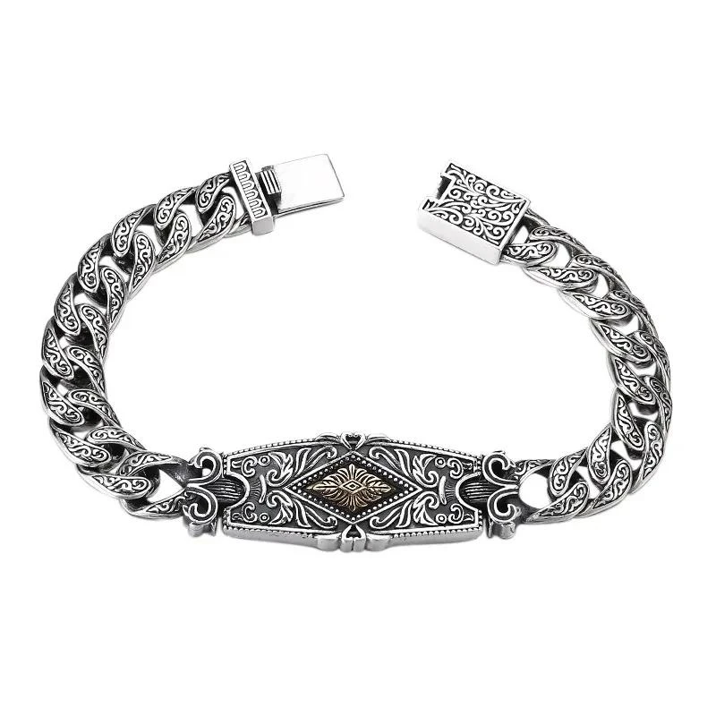 L’esthétique sophistiquée de ce bijou en argent ne passe pas inaperçue. Les motifs finement ouvragés ajoutent une dimension artistique à l’ensemble, créant une pièce qui se démarque par son élégance intemporelle. Que ce soit pour une soirée élégante ou une occasion spéciale, ce bracelet est le compagnon idéal pour l’homme moderne qui recherche l’élégance sans compromis.