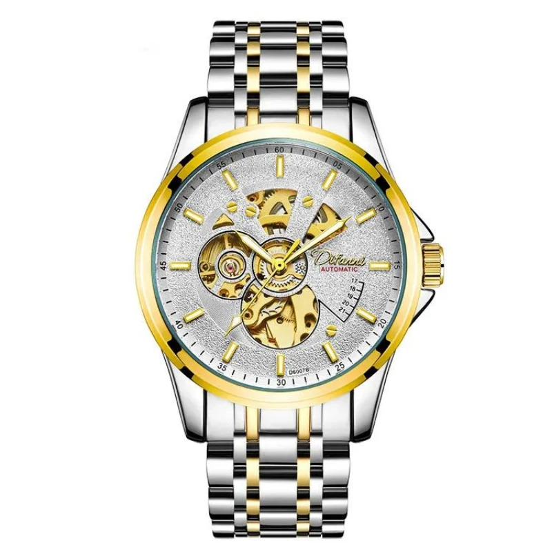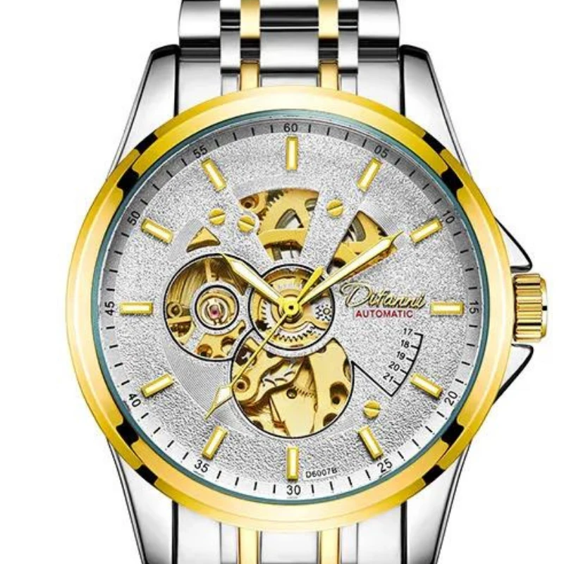 À la jonction de l’élégance et de l’artisanat parfait, ressentez le temps avec la montre argentée pour homme. Cette montre automatique de luxe est soigneusement fabriquée en acier inoxydable de couleur argent, affichant une élégance raffinée. Le cadran de la montre reflète également la même teinte argentée tout en mettant en valeur ses détails travaillés en couleur or, offrant un équilibre esthétique pour une élégance maximale.
