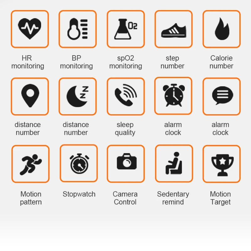 Fonctions spéciales : décoration, éclairage, prévisions météorologiques, alarme, chronographe, calendrier, podomètre, indication des 24 heures, affichage des phases de la lune, affichage de la semaine, dispositif intelligent portable, affichage du mois, pression artérielle, fréquence cardiaque, surveillance du sommeil.